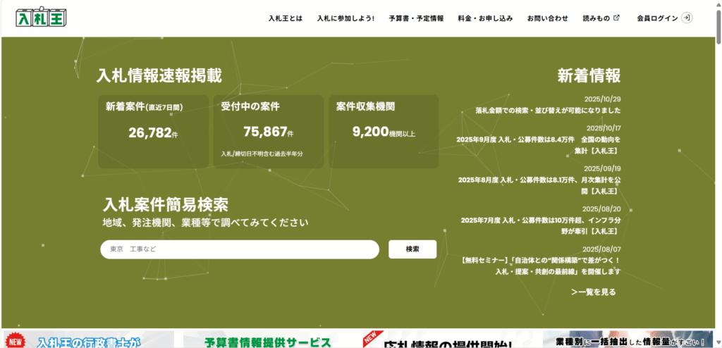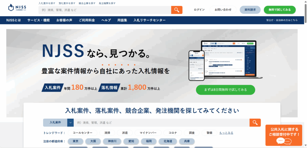 情報収集範囲の広さに優れていて、官公庁、地方自治体の収集以外にも財団法人、社団法人など様々な機関の情報をデータベースに登録しています。ほかのサービスではあまり取り扱っていない入札予定、予算書情報も収集をしていることが特徴的です。国内初の入札情報サービスとして運営実績が17年以上あり信頼できるサービスといえます。